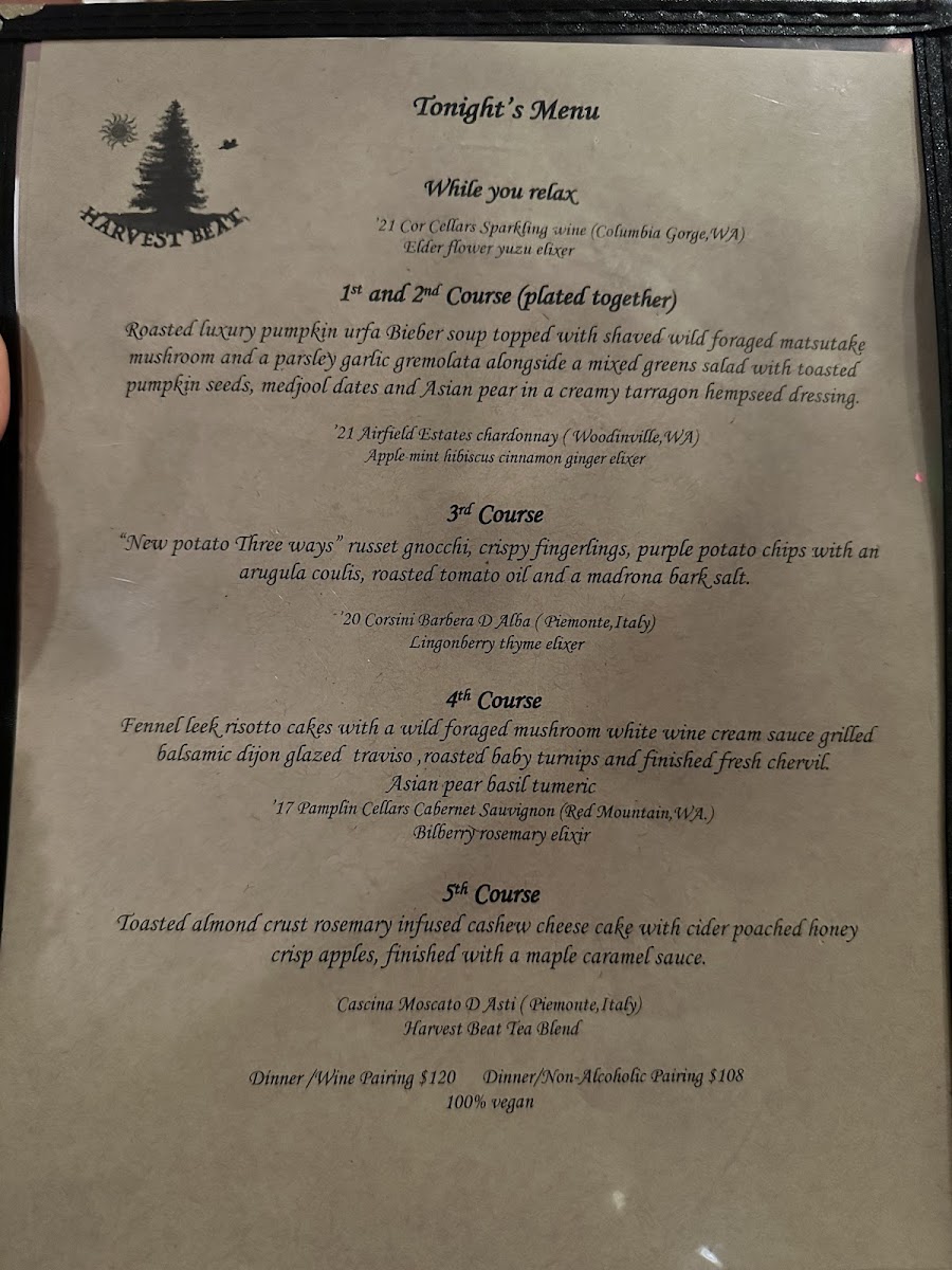 Welcome to Harvest Beat, a unique vegan fine dining experience nestled in Seattle. This innovative restaurant embraces the beauty of plant-based cuisine, showcasing seasonal ingredients through a thoughtfully crafted five-course menu. Each dish is a celebration, with standout ingredients, particularly mushrooms, prepared in delightful variations.